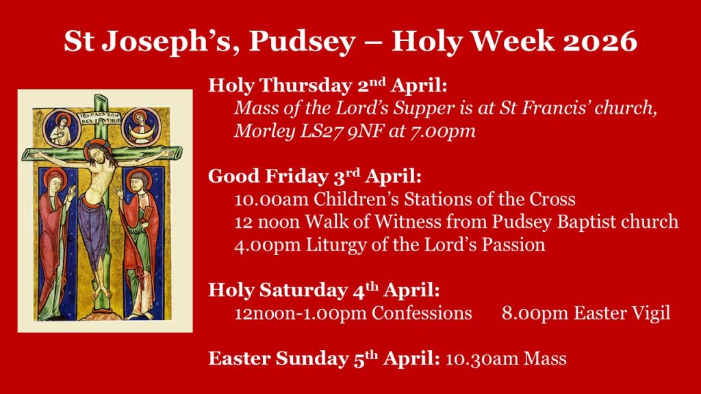 We are the Catholic parish for the Pudsey, Swinnow, Stanningley, Farsley, Woodhall, Fulneck & Troydale parts of Leeds, and we belong to the Catholic Diocese of Leeds.